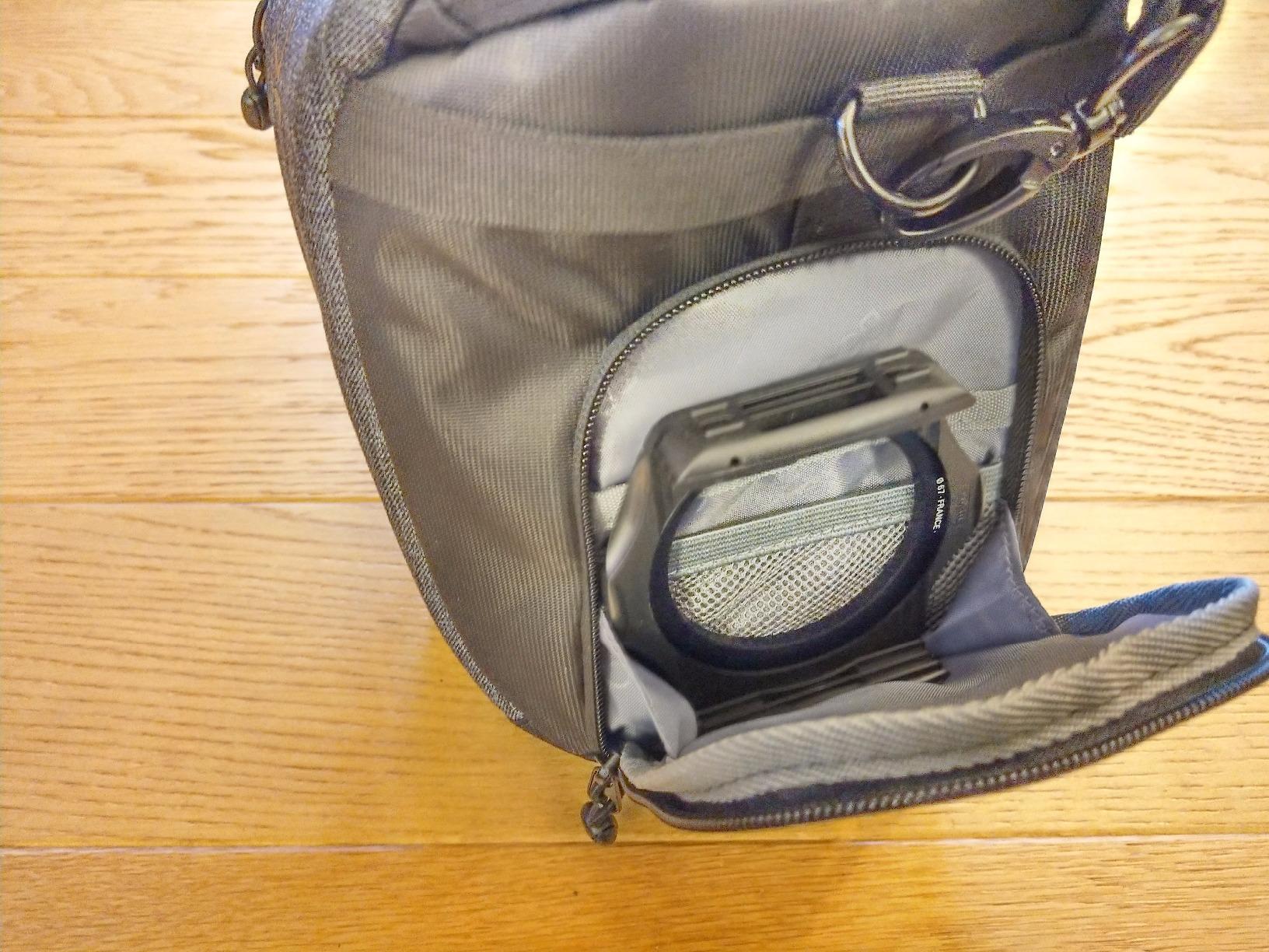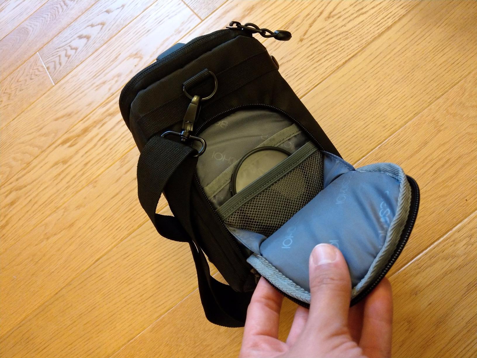 I've been using the side pockets to store a filter holder and filters as they are just the right size. The zipable inside pocket is good for memory cards and smaller items like cables and card readers and as it's inside it's protected..