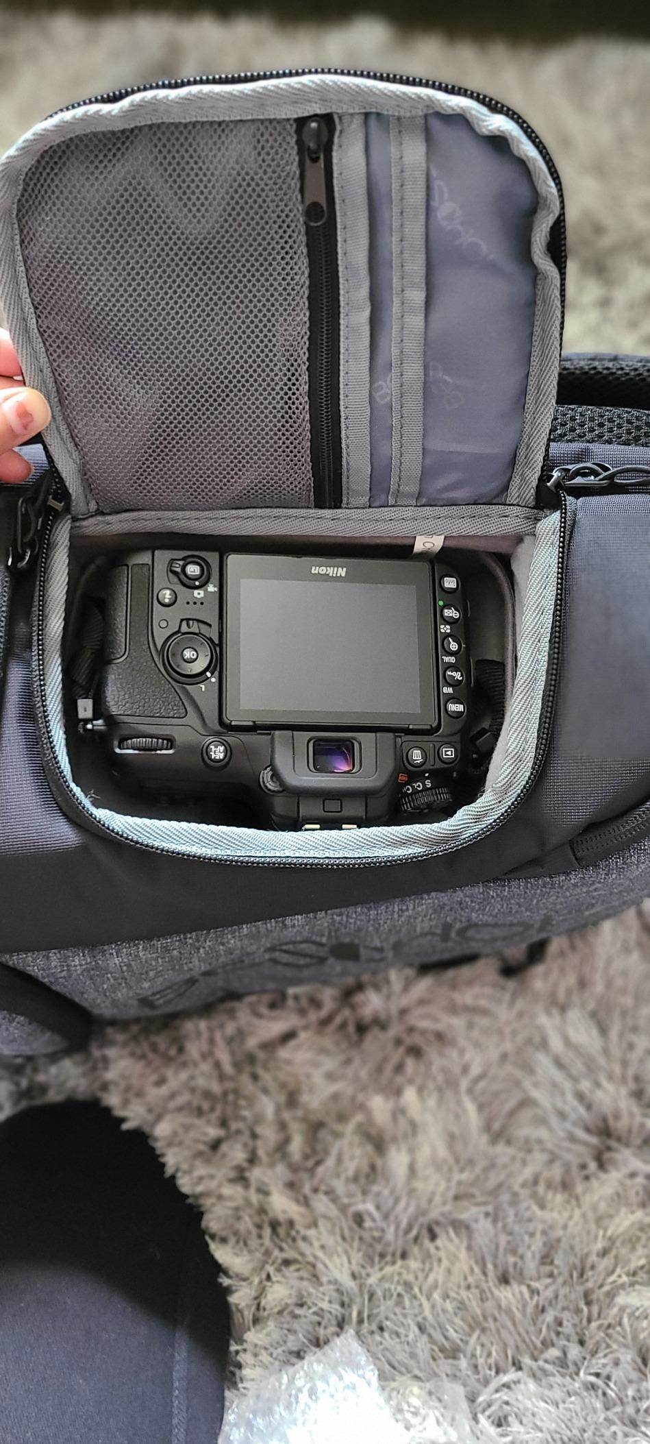 I have a Nikon D3500 so not the biggest camera but I can put it in the side with my 70-300mm lens attached no problem. This lens can also go straight in the bottom as shown in pics. In the top section I have a couple of pouches of filters and my pixie evo with more than enough space.
