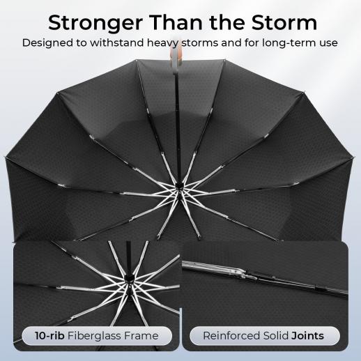 - * Durable, Rust-proof Construction: This folding umbrella is an investment in quality. The frame is engineered with a rust-proof alloy shaft and resilient fiberglass ribs, ensuring it won't break or corrode like cheaper models. The fiberglass, non-slip handle is built for a comfortable grip and long-term reliability.