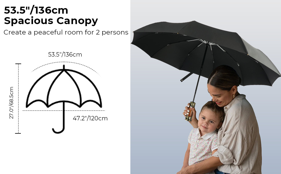 - * 53.5-inch Arc Canopy for Two: Stop juggling a small umbrella. Our travel umbrella with a massive 53.5-inch arc canopy (45.3-inch diameter) provides generous coverage for two people, side-by-side. It keeps you, your partner, and your belongings completely dry. Perfect for couples, parents, or anyone wanting full protection.