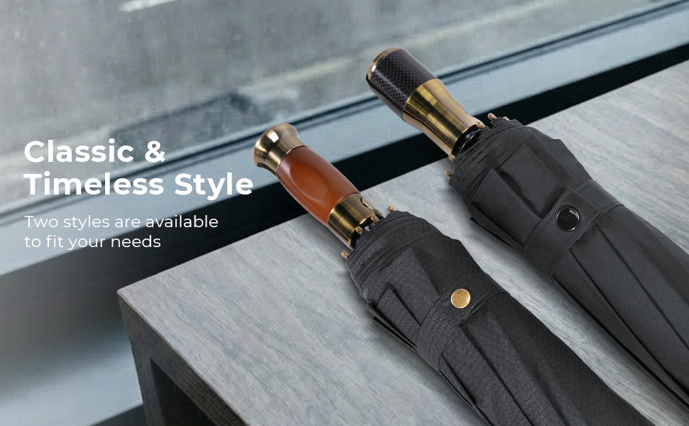 Choose your perfect companion: the timeless elegance of a solid wood handle paired with a subtly patterned canopy, or the modern, high-performance feel of a sleek carbon fiber handle and minimalist design. Both offer a secure, no-slip grip for confident handling, ensuring you stay dry and composed, even when the storm hits hardest.