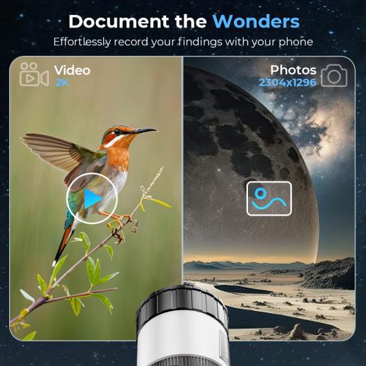 - * 4H Battery Life, Stay in the Moment Longer: The built-in 2000mAh rechargeable battery provides up to 4 hours of viewing, recording, or sharing. And with a standard Type-C interface, you can easily power it using your phone charger or a power bank during long stargazing sessions—ideal for overnight astronomy events or outdoor exploration.