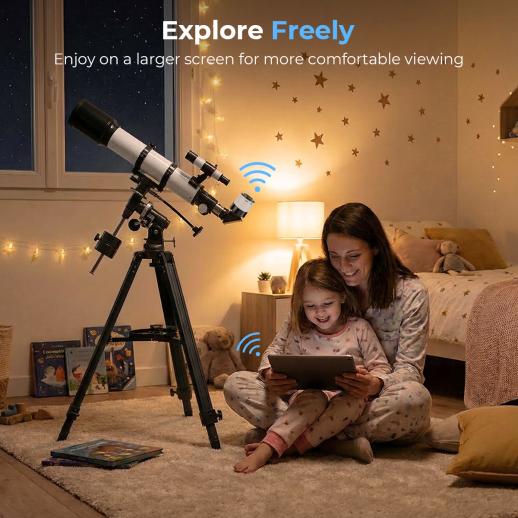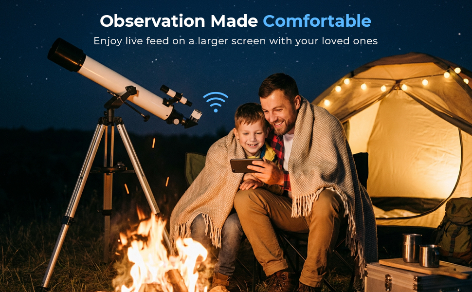 - * Wireless Freedom, Enjoy on a Bigger Screen: With the built-in WiFi, the telescope eyepiece camera lets you stream the live image directly to your phone or tablet. Sit back, relax, and watch the cosmos from a better angle while your telescope stays perfectly positioned. Ideal for sharing with family, classroom demonstrations, or group skywatching nights.