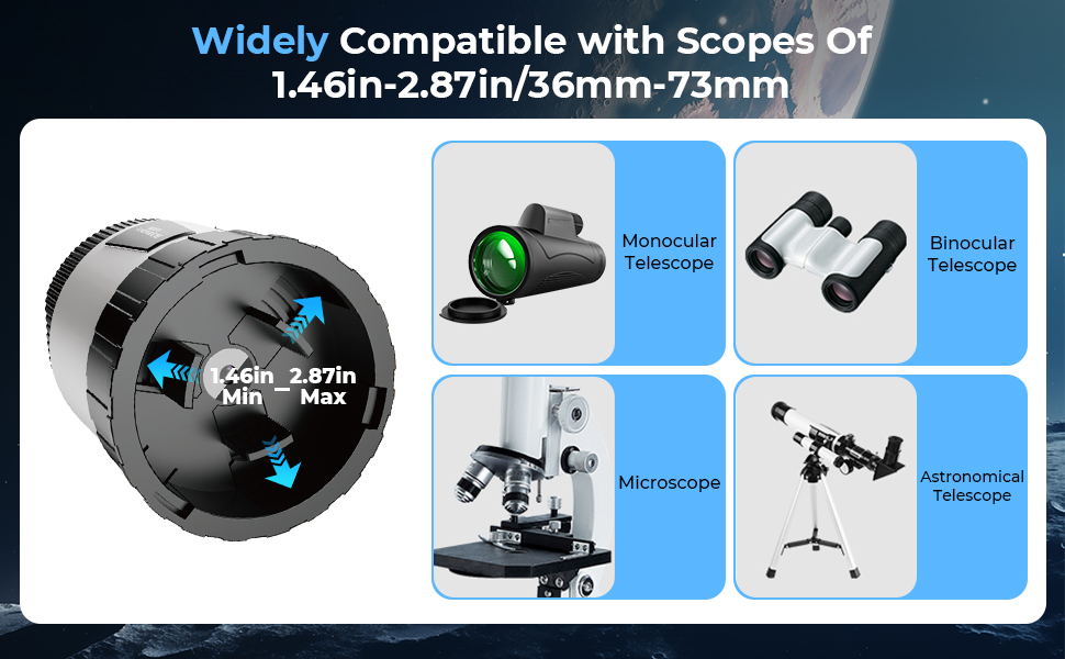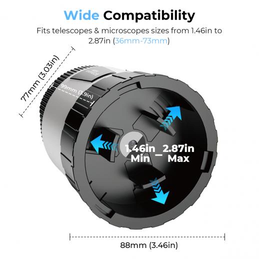 Our adjustable mounting ring ensures compatibility with a wide range of optics (36-73mm/1.46–2.87in diameter), including monoculars, binoculars, telescopes, and microscopes. Perfect for birdwatching, hunting, stargazing, solar eclipse viewing, and microscopic observation.