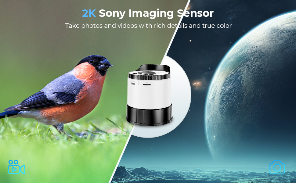 Capture breathtaking 2K 30FPS videos and 2304x1296 photos with our 3MP camera and advanced CMOS sensor. Experience crystal-clear detail, even under challenging low-light conditions, making stargazing easier than ever. Support up to 256GB storage card.