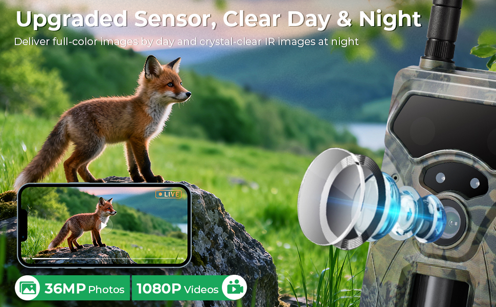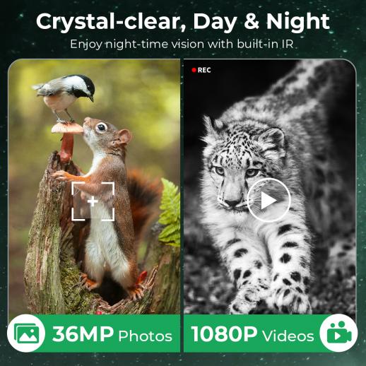 - * Crystal-clear Day & Stealthy Night Vision: Our 4G trail camera records smooth 1080P 30fps videos with audio and brilliant 36MP photos, ensuring you can identify every detail with razor-sharp precision. When darkness falls, two 850nm low-glow IR LEDs illuminate the scene up to 65ft/20m away, capturing crisp black-and-white images without startling wildlife.