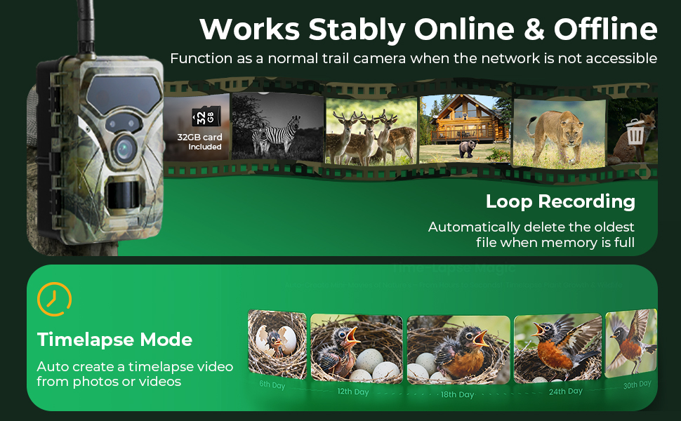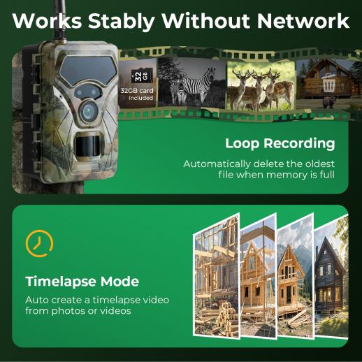 A 4G Trail Cam and a Traditional Trail Cam in One. Enjoy instant 4G alerts when you have a signal, and trust its rock-solid local recording when you don't. This camera seamlessly ensures continuous operation on the memory card, so you're always covered. It also comes fully equipped with time-lapse and loop recording for versatile, long-term monitoring.
