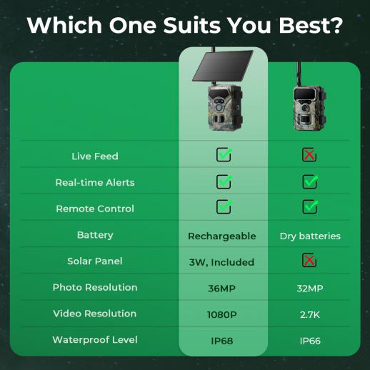 - * Remote Live View, Your Eyes on the Field 24/7: Our solar game camera streams a live feed directly to your phone via the "TrailCam Go" app. Whether you're at home or on the road, you can instantly check your hunting grounds, monitor wildlife patterns, or manage camera settings from anywhere. No more wasted trips to pull cards—your property is always just a tap away.