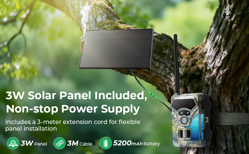 - * 365-Day Solar Power, Set It & Forget: This 4G trail camera is equipped with a 5200mAh rechargeable battery and an energy-efficient chip for months of standby. Moreover, we include a 3W solar panel, providing year-round power. The 10ft/3m extension cable allows you to flexibly place the panel in the perfect sunny spot and let the camera stand guard through the entire hunting season.