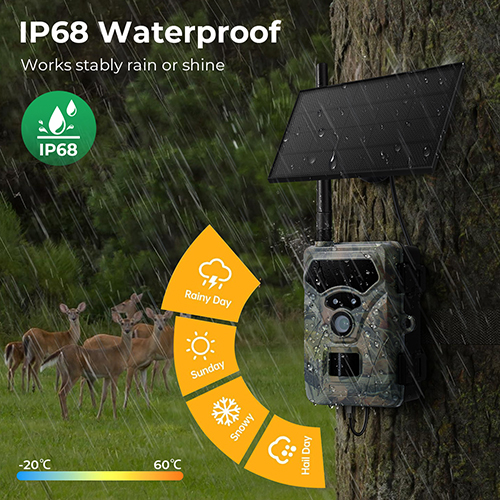 - * Work Stably Rain or Shine, Online or Offline: The rugged IP68 waterproof housing ensures flawless operation through pouring rain, heavy snow, and harsh sun. Venturing off-grid? No problem. In areas without a 4G signal, it functions as a traditional trail camera, saving all footage to your memory card for instant playback on the built-in 2-inch screen.