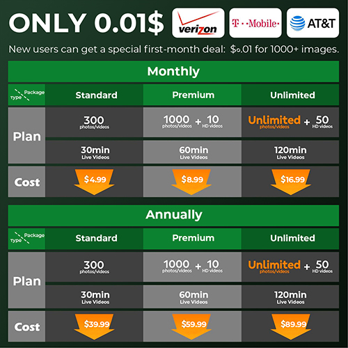 Choose flexible data plans starting at just $4.99 /month or $39.99 /year. New users get a special first-month deal: $0.01 for 1000+ images.