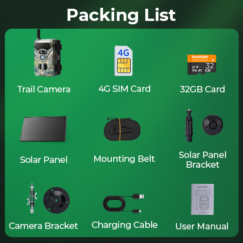 1x 4G Trail Camera; 1x Solar Panel; 1x 4G SIM Card; 1x 32GB Storage Card; 2x Intallation Bracket; 1x Mounting Belt; 1x User Manual; 1x Charging Cable