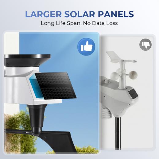 - * 【7-in-1 Outdoor Sensor】The outdoor sensor consists of rain funnel, solar panel and transmission module, wind vane and high-speed anemometer. Long range wireless sensors connect to the console up to 300 feet away. Most applications are limited to 100 feet due to buildings, walls, and interference and the wireless signal will not pass through solid metal. The main power source for the sensor is a solar panel, and the sensor array requires 3 AAA batteries (not included).