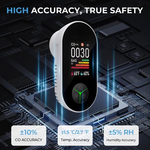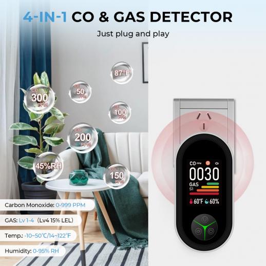 - Breathe easy with 24/7 protection! This 4-in-1 carbon monoxide gas detector continuously monitors carbon monoxide, gas leaks, temperature and humidity with high accuracy. Its color-coded alerts (Green to Red) and 85dB alarm instantly warn you of danger, while the clear 2" display keeps you informed the specific data. Just plug in - no setup needed! Trusted by homes, hotels and offices for reliable, worry-free safety.
