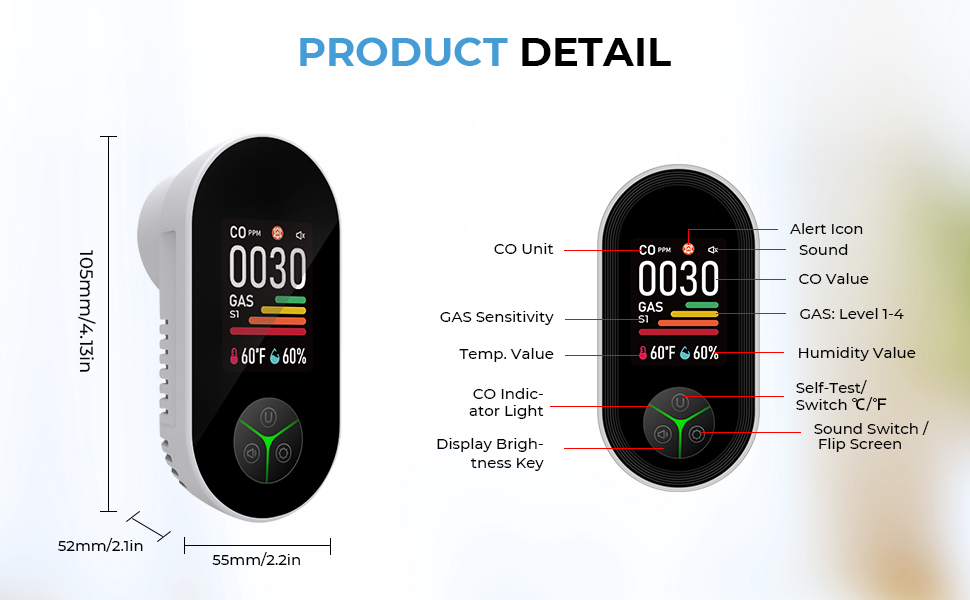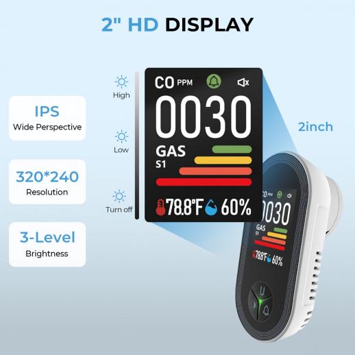 - * 【Simple Plug-and-Play Operation & 2in HD Display】No complicated setup needed—just plug it into a standard AC outlet and start monitoring instantly. The 2-inch HD screen of our gas leak detector displays gas level, CO value, temperature, and humidity all at once, allowing you to check your home's air quality at a single glance.