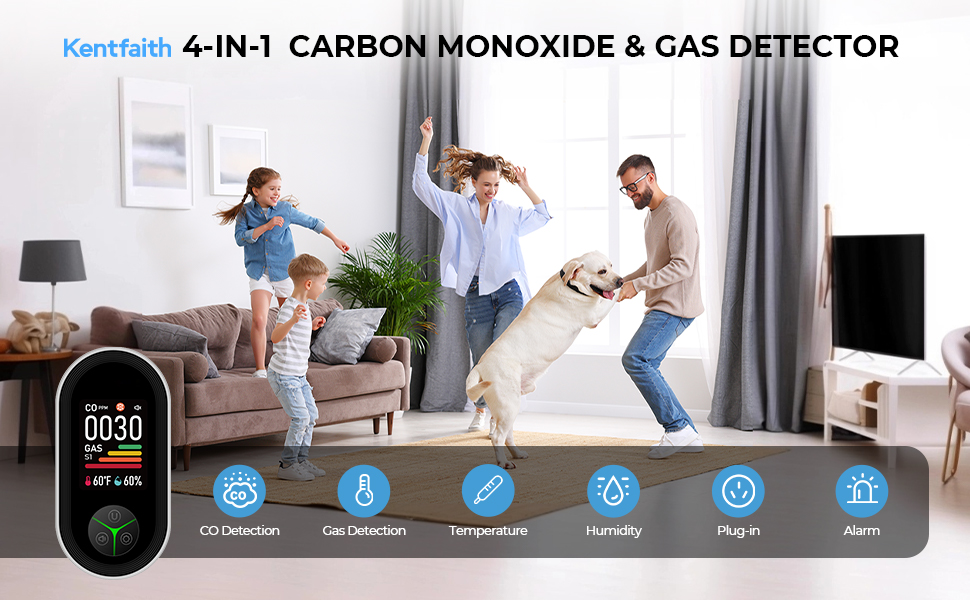 - * 【4-in-1 Upgraded Carbon Monoxide & Gas Detector】Enjoy complete peace of mind with real-time protection. Kentfaith upgraded 4-in-1 detector continuously monitors natural gas, carbon monoxide, temperature, and humidity, displaying all data on a bright, easy-to-read digital screen. Whether you're cooking, relaxing, or sleeping, you can breathe with peace of mind.
