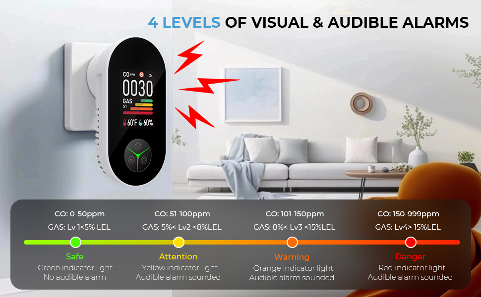 - * 【4-Level Visual & Audible Alarms】Stay informed with 4 colors of icons and indicators —Green (safe), Orange(attention), Yellow (warning), Red (danger) that clearly reflect the current safety status. When the CO value reaches 51 PPM or the gas level reaches Lv2, the loud 85dB alarm immediately alerts you. Whether it's a small rise or a critical emergency, you'll always know when action is needed—giving you and your family more time to stay safe.