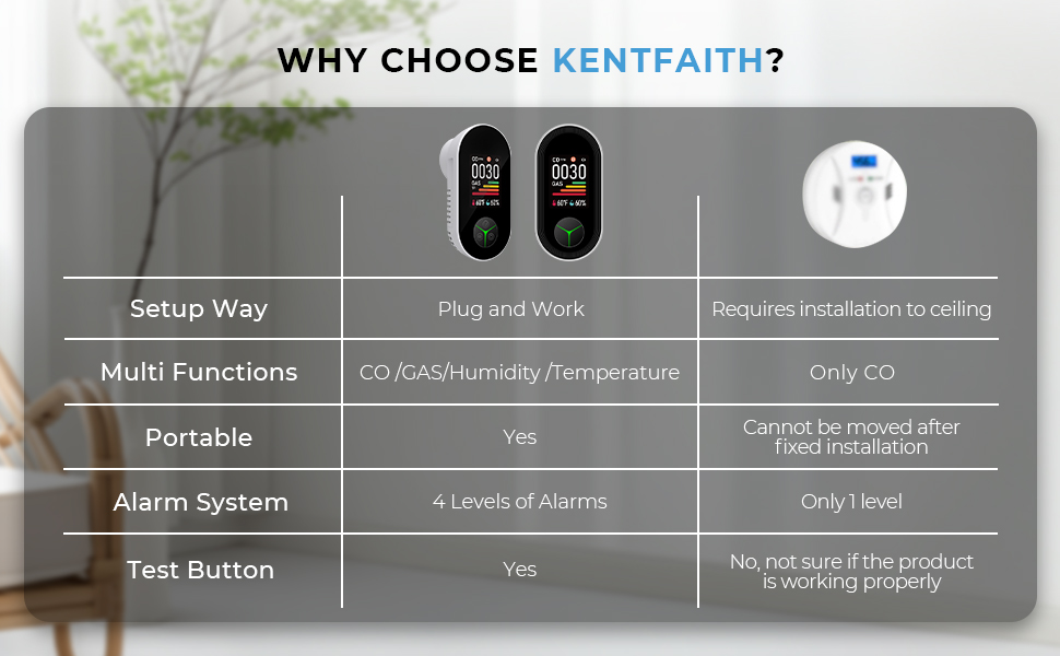 - * 【Your Ultimate Safety Companion】Kentfaith travel CO monitor is perfect for homes, apartments, kitchens, bedrooms, living rooms, bathrooms, garages, offices, restaurants, hotels, RVs, and warehouses. Wherever life takes you, this gas and carbon monoxide detector provides the reliable protection you and your loved ones deserve.