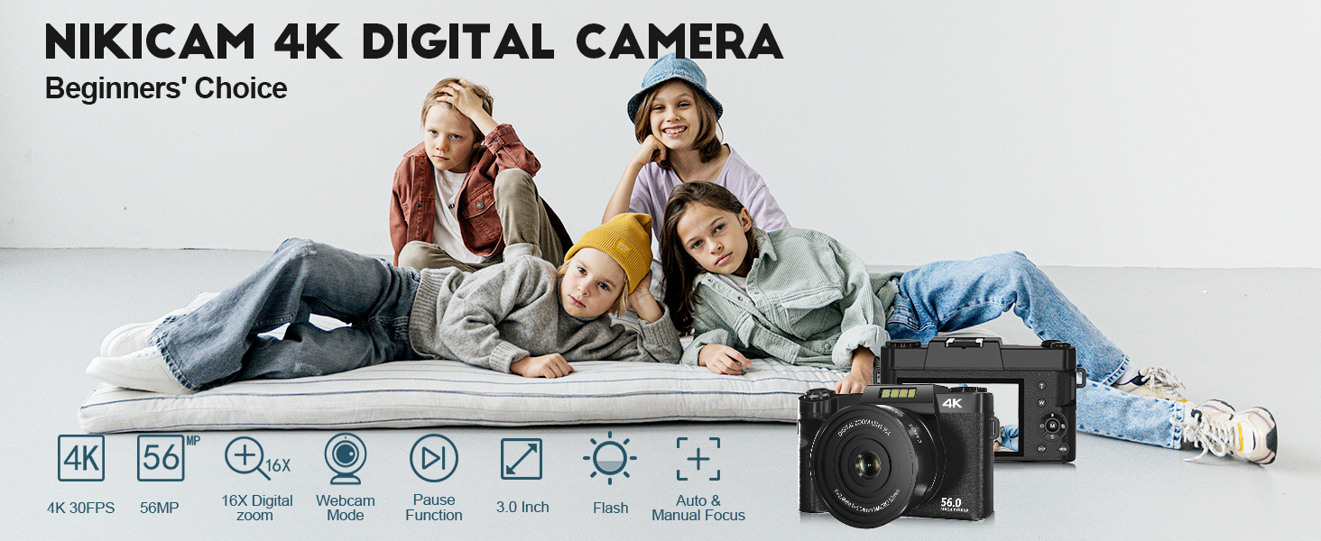 - * 【Vlogging Camera for Beginners and All Ages】:This is a cheap affordable entry-level camera, easy to use for designed for beginners ,NIKICAM camera has an ultra-compact design, easily putting the compact portable camera in your pocket. The upgraded lightweight feel of the shoot will keep your hands from getting tired.
