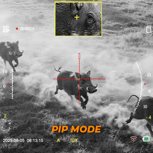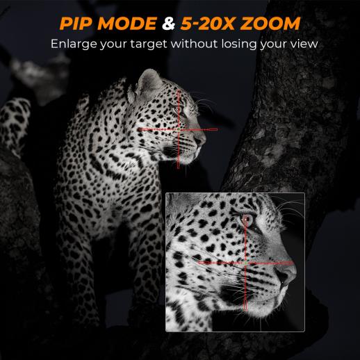 See the target up close while keeping the full scene in view. PIP mode magnifies the center 8× for precise tracking, letting you spot wildlife, monitor distant areas, or aim with confidence—even in the darkest conditions.