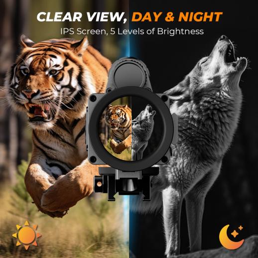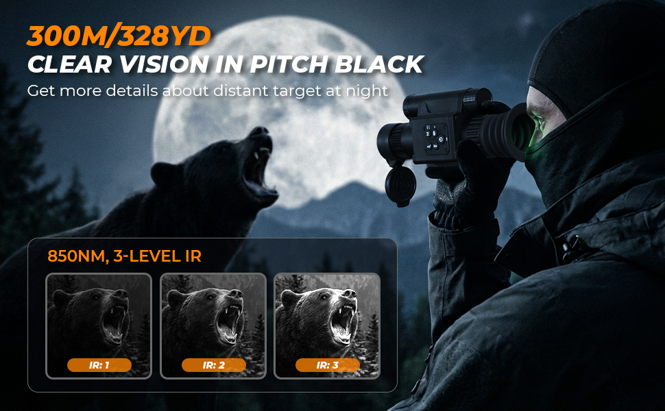 Don’t let nightfall hide your target. With a powerful 850nm infrared illuminator and 3 adjustable IR levels, this digital night vision scope reveals every detail up to 300 meters (328 yards) away—even in complete darkness. Whether you’re observing wildlife, scouting distant landscapes, or monitoring for security, you can see clearly, track precisely, and act confidently—no matter how dark it gets.