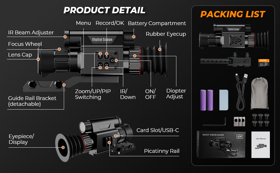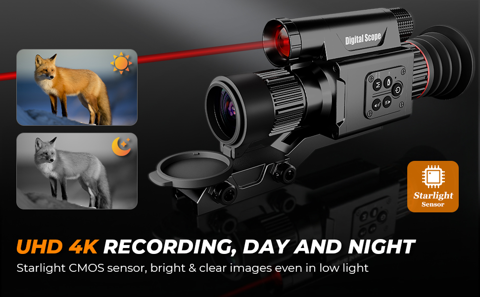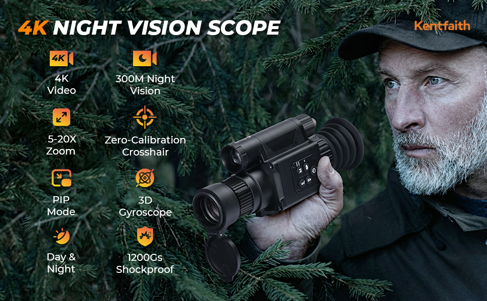 - * 4K UHD Video, Capture Every Moment: Powered by Sony’s advanced Starlight Sensor and precision 3D Gyro Stabilization, Kentfaith night vision scope delivers ultra-smooth 4K UHD footage with stunning clarity. Whether under bright daylight or in total darkness, every detail is captured with exceptional sharpness and stability.