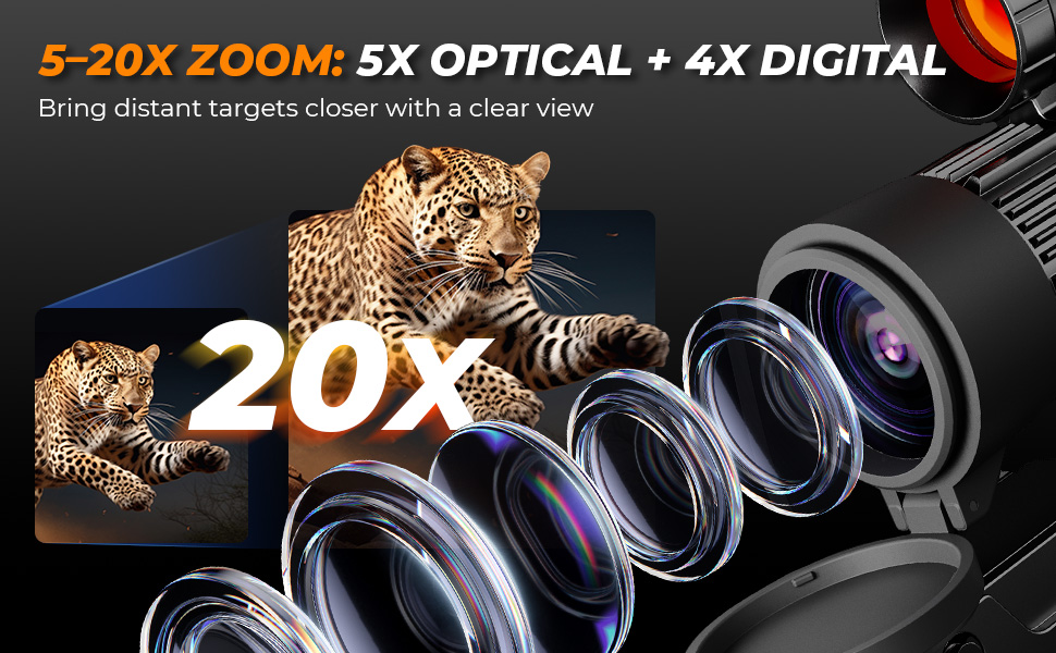 - With ultra-clear 4K resolution, 300 m night vision, and precise 5–20× zoom, every movement stays sharp—perfect for wildlife spotting, night hunting, surveillance, or accurate targeting.