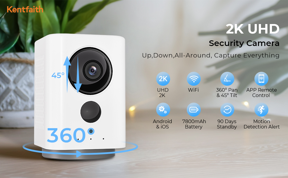 - * 100% Wireless, 360° Pan 45° Tilt & Wifi Live View: Kentfaith's wireless security camera offers easy security with 360° pan, 45° tilt and remote Wifi monitoring via app. Compact, 100% wireless design lets you install it anywhere: home, car, camping trips, or while traveling. Keep an eye on your property, home, or vehicle effortlessly, so you stay secure on the go.