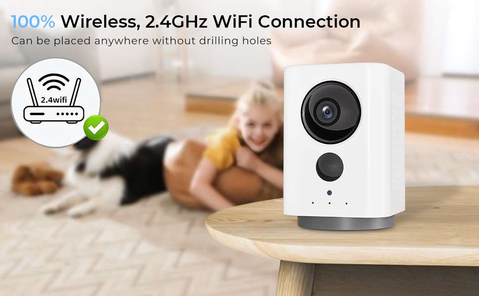 - ·2.4GHz WiFi Connection—Just connect to your home WiFi, download the app, and you’re ready to watch over your family, pets, or valuables from anywhere. Whether you’re at work, on vacation, or just in the next room, our 2.4GHz WiFi camera keeps your home within reach.