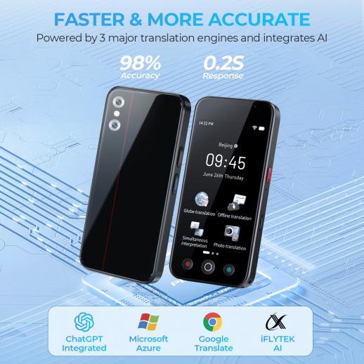 - * 【Powered by ChatGPT + 3 Translation Giants】Unlike most translators that depend on a single engine, the Kentfaith language translator device harnesses the combined power of three top engines—Microsoft Azure, Google Translate, and iFlytek. This synergy delivers up to 98% accuracy with lightning-fast 0.2-second response times, ensuring seamless and reliable communication wherever you are.