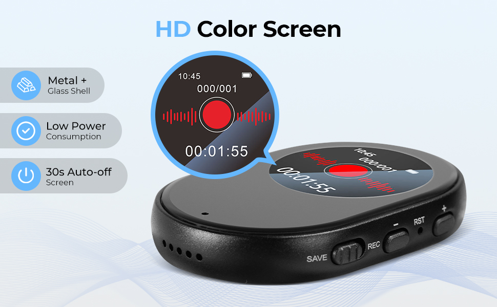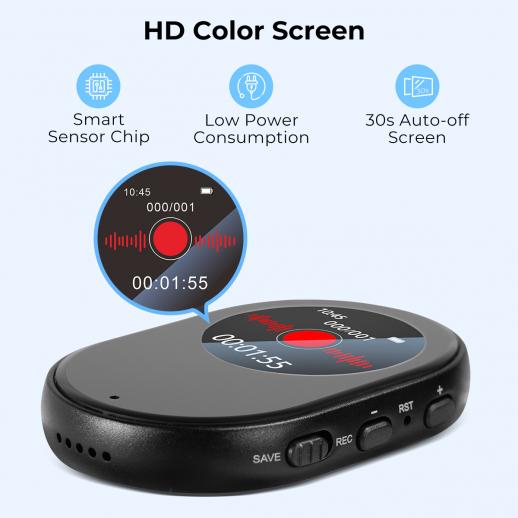 - · 30s Auto-off Screen: Worried about dead batteries mid-recording? Our Low-Power Consumption design allows the voice activated recorder to run for hours on a single charge. Plus, the 30s Auto-off Screen saves juice without interrupting your work—no more fumbling to turn off the display when you’re done.
