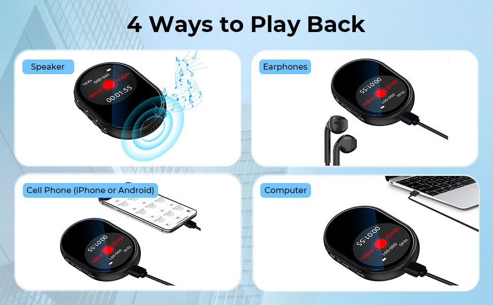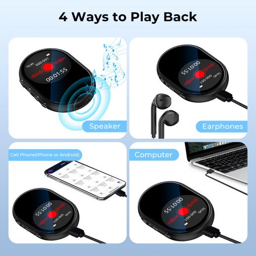 - · 4-way Playback: Speaker, Earphones, Cell Phone (iPhone or Android), Computer. Our 4 Ways to Play Back feature lets you choose how you listen, making every recording accessible and convenient.