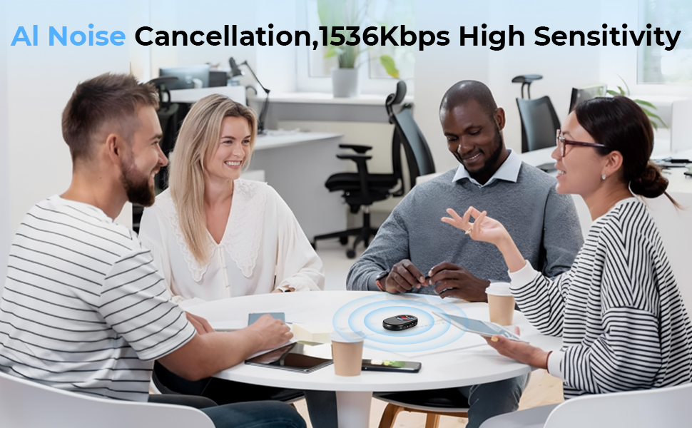 Absolutely! It features AI Noise Cancellation and 1536Kbps High Sensitivity—so it cuts through background chatter, traffic, or AC hum to capture crisp, clear voices. Perfect for meetings, lectures, or interviews, even in crowded spaces!
