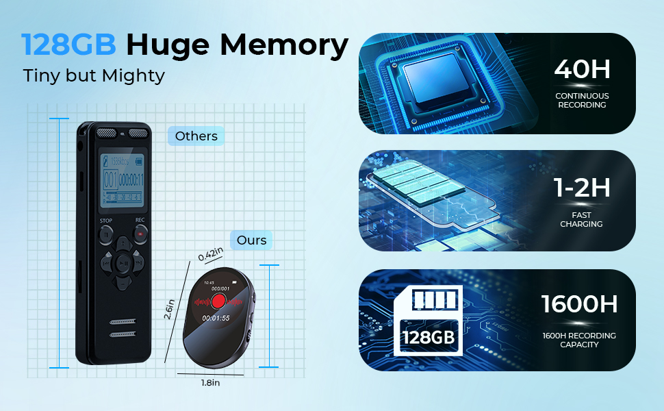 - · 128GB Memory: Stores up to 1600+ hours of audio—no need to delete old files to make space.