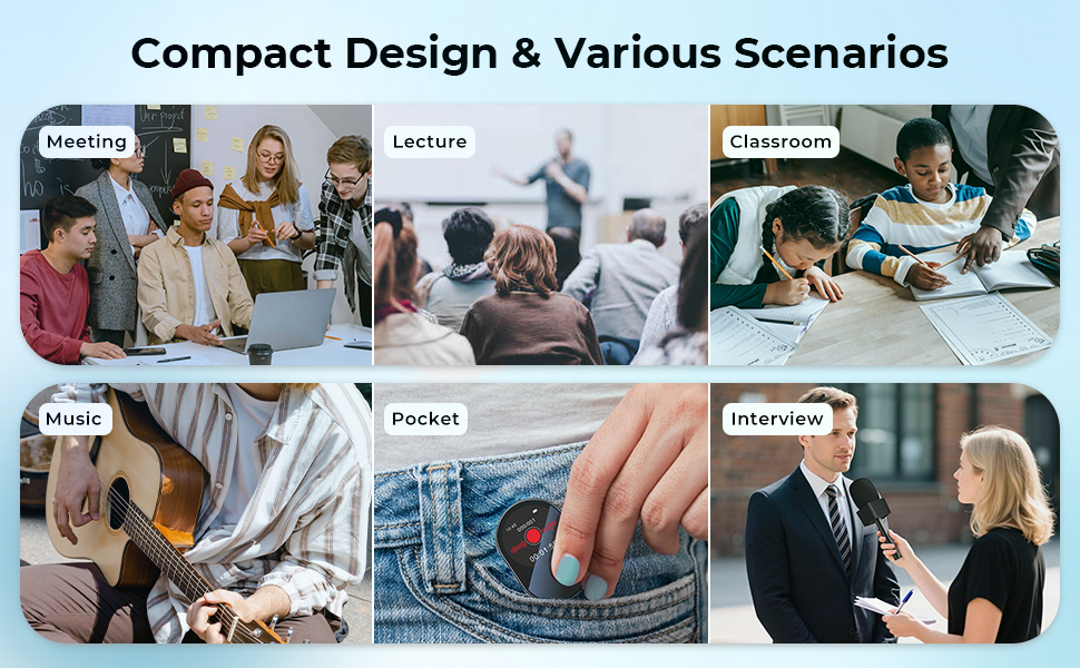 - · Compact Size: Smaller than a credit card—slip it into your purse, or notebook pocket for on-the-go recording.