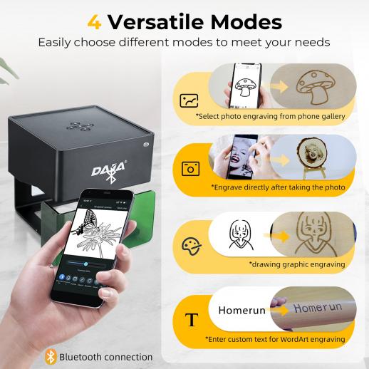 - * 【Easy Connection, Simple Control】You can effortlessly control your portable laser engraver via Bluetooth (Android/iOS) or USB (Windows/Mac). After connection, just choose your design and go! It supports JPG, BMP, PNG, DWG, DXF, and SVG, and offers four engraving modes (black & white, discrete, outline). Moreover, it supports offline engraving for instant access to your last project.