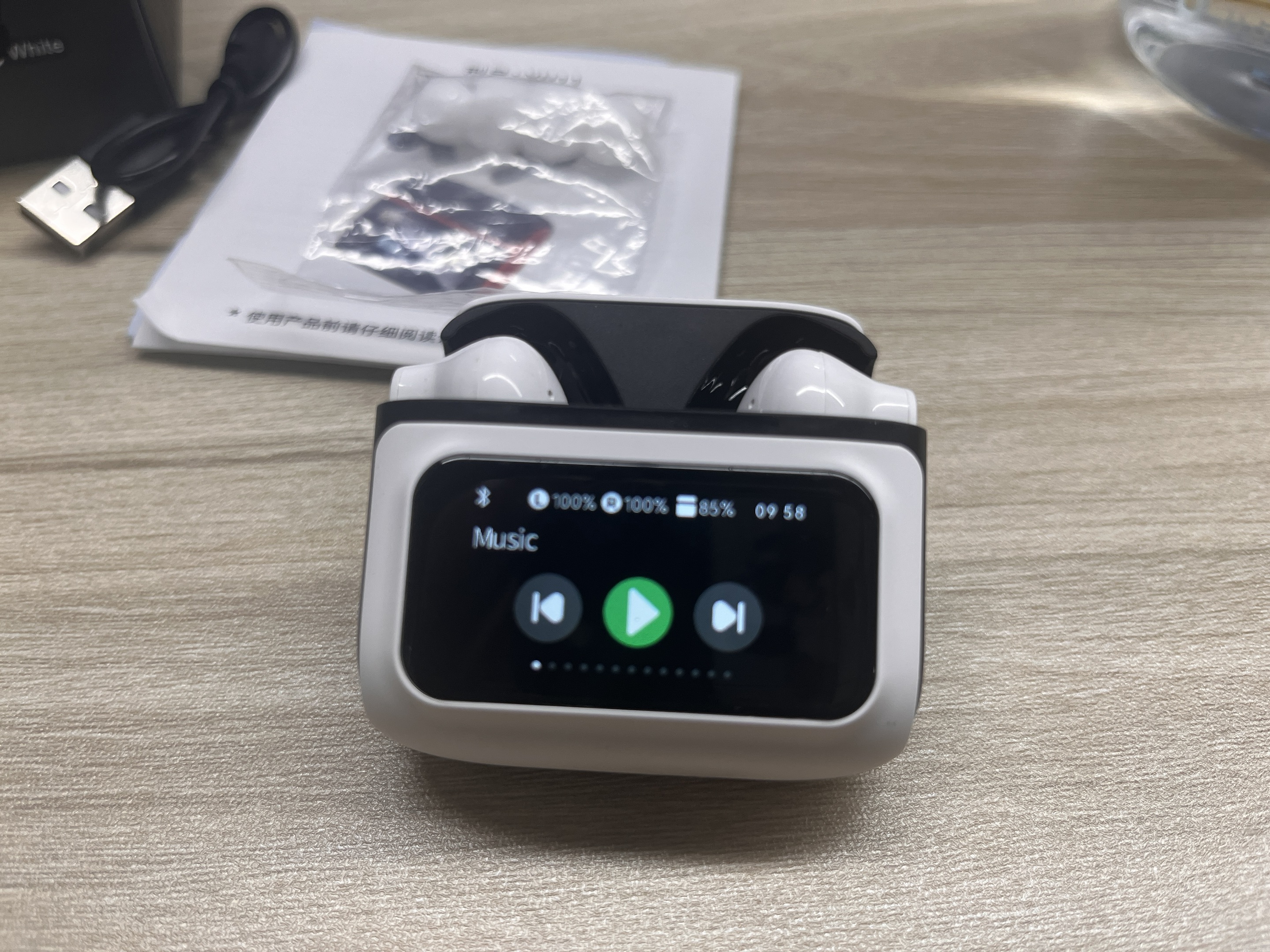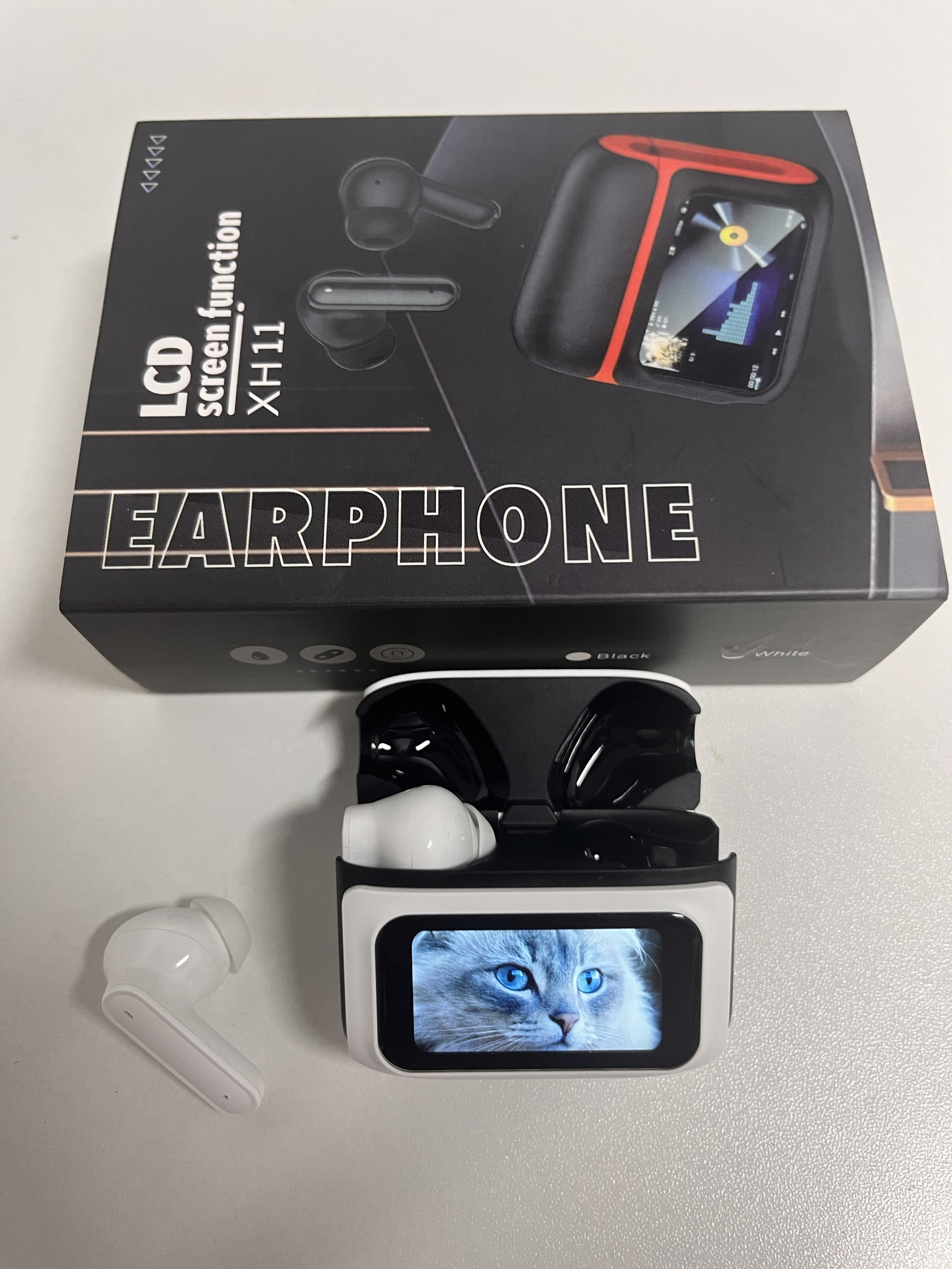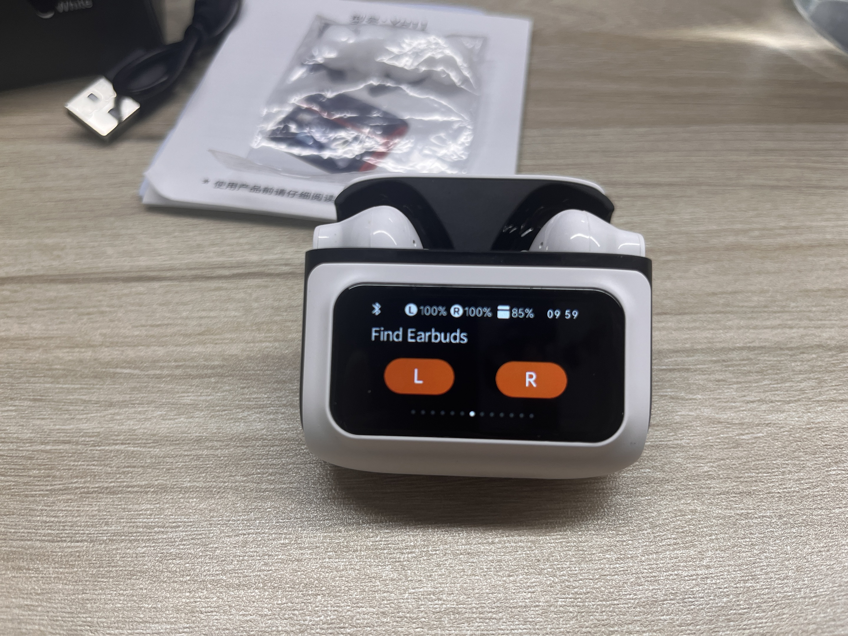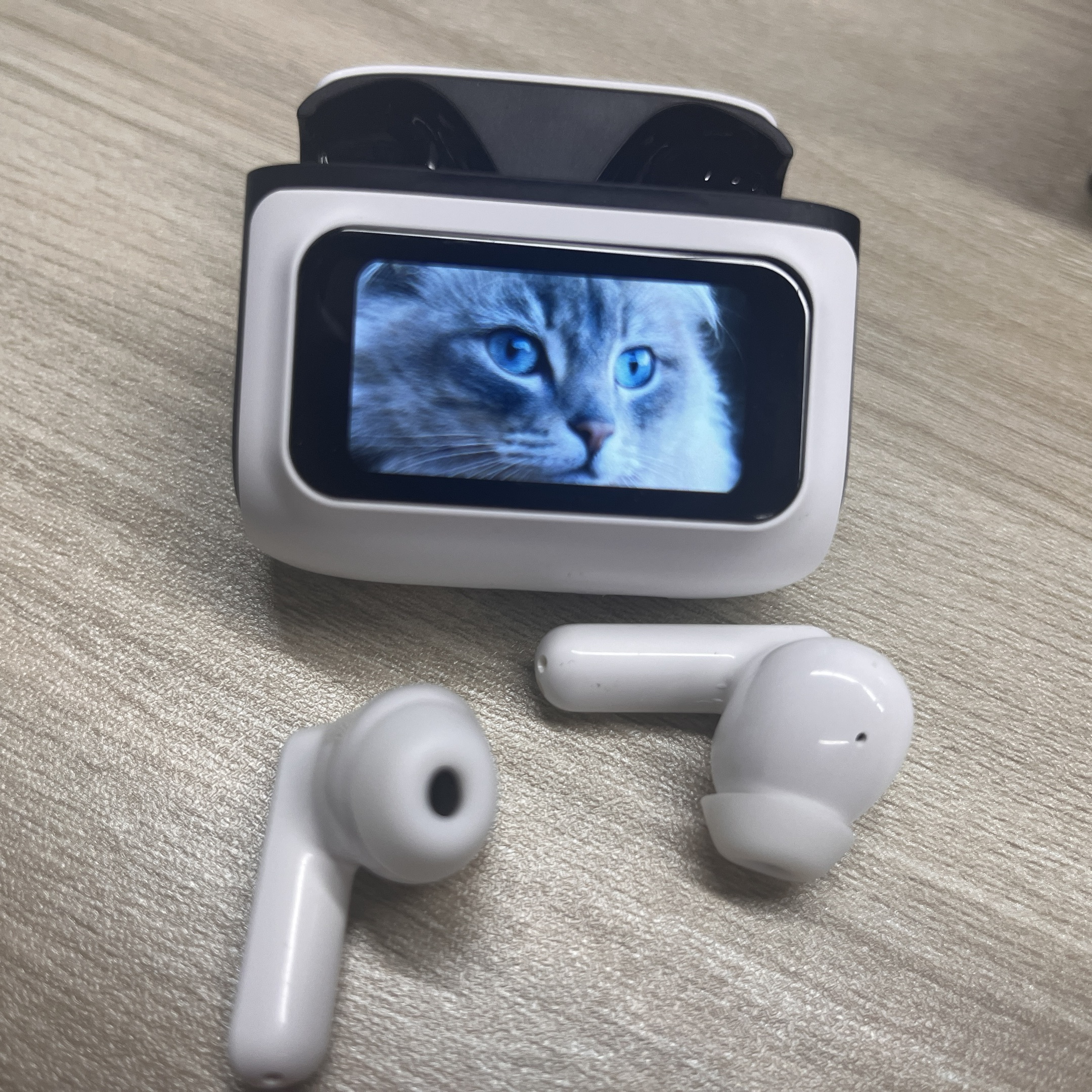 The charging case features an LCD touchscreen that displays the battery level of each earbud and the case itself. Plus, view the time, see song lyrics, adjust volume, switch tracks, tweak EQ, change languages, etc.
