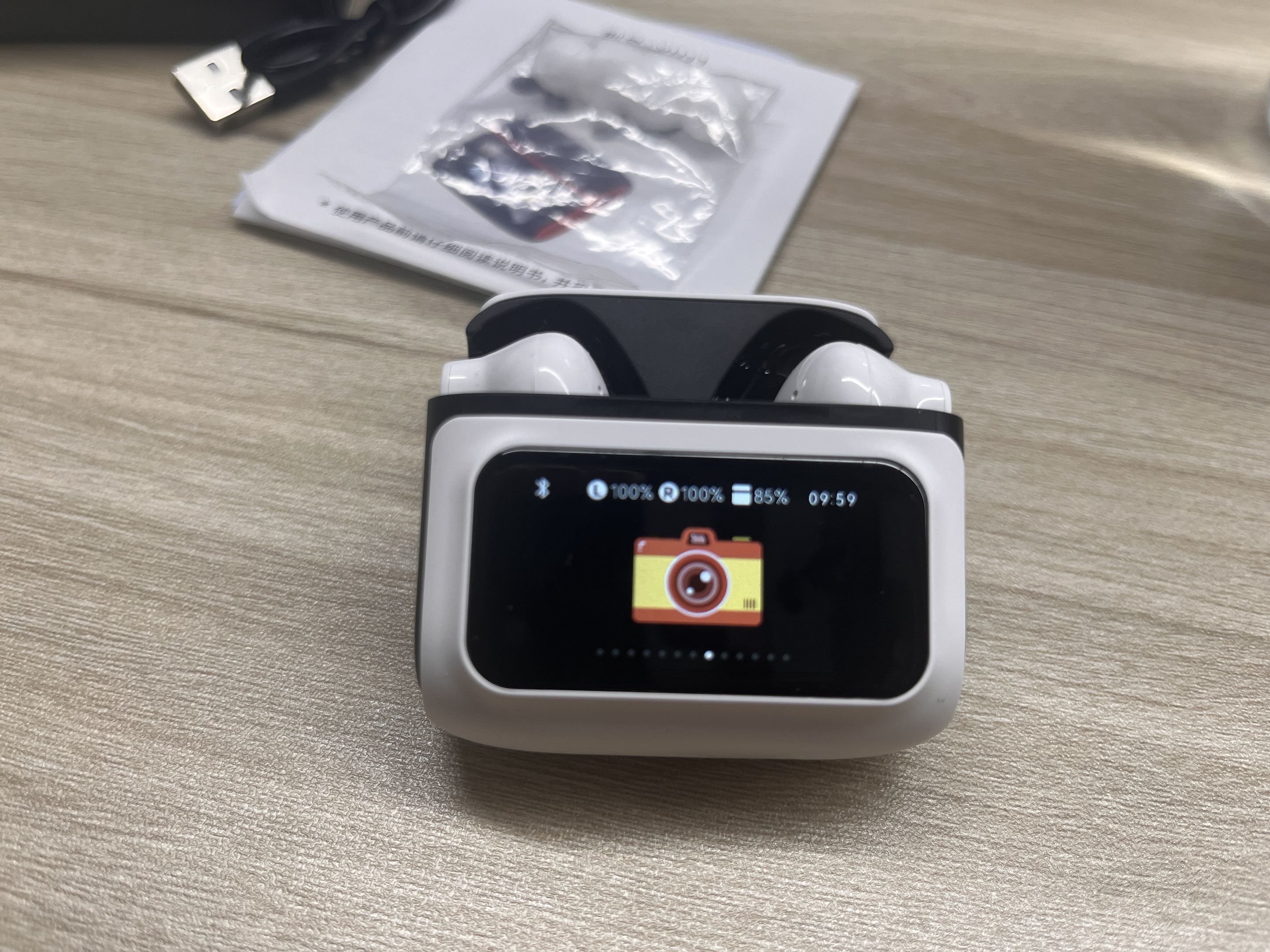 - * 【Crystal Clear Sound, LCD Touchscreen】With advanced dual-mic ENC technology, Kentfaith live translating earbuds cut up to 45dB of ambient noise, making sure every word comes through clear. Plus, the built-in LCD Touch Screen puts you in control: check battery and time, switch tracks, tweak EQ, and even remotely trigger your phone’s camera—all from your earbuds' charging case.