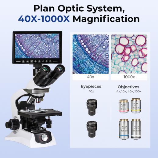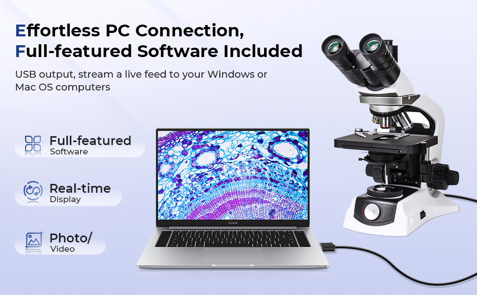 - Our compound microscope for laboratory features an upgraded 10” 4K smart display integrates a 5MP camera and built-in imaging computer, letting you capture 1080P photos and videos at the press of a button—no PC required, ideal for recording time-lapses or documenting lab work. Want more control? Connect directly to your PC—no microscope camera setup needed—and dive into our Windows software packed with measurement tools and advanced editing features.