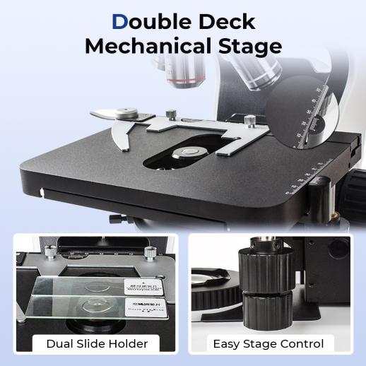 - * 【Double-layer Mechanical Stage & Easy Focus】The double-layer mechanical stage with dual slide clamps keeps your samples steady and lets you compare side-by-side with ease. The stage offers a smooth, precise X-Y travel range of 75mm × 52mm with 1.0mm accuracy. Coarse and fine focus knobs are separated for better control, so you can snap into sharp focus fast, even on the tiniest details.