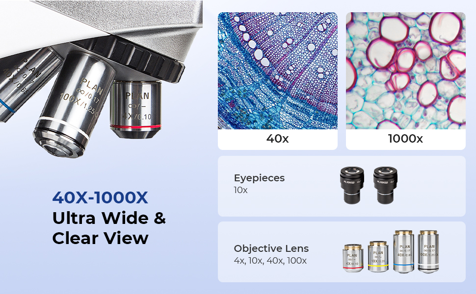- * 【Infinity-Corrected Optics & 22mm Flat Field Eyepiece】Equipped with a high-end infinity optical system and PL10X/22mm high point eyepieces, Kentfaith compound microscope for laboratory delivers exceptionally flat, wide-field images with over 95% clarity and minimal field curvature. Switch between 4X–100X PLAN objectives for crisp magnification from 40X to 1000X—perfect for serious observation.