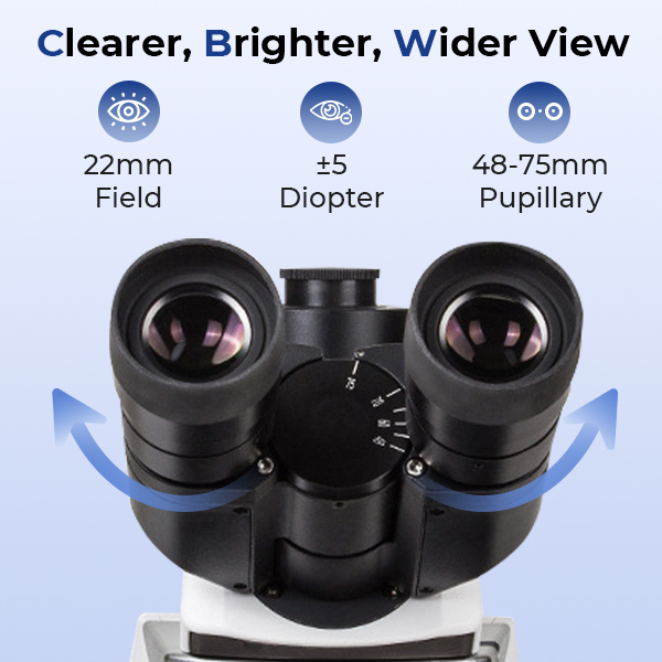 These eyepieces provide a wider 22mm view versus the standard 18mm, enabling you to see more of your sample at once. Flat-field apochromatic correction delivers precise colors, excellent field flatness, and sharp edge-to-edge clarity. It also delivers a comfortable and natural viewing experience and reduces eye fatigue for long-time use.