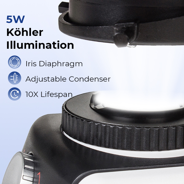 - * 【Sharper Contrast with 5W Koehler Illumination】Equipped with a powerful 5W Koehler LED system (vs. the usual 3W), this lab microscope delivers bright, even, and natural illumination. The 1.25 N.A. Abbe condenser with iris diaphragm and independent lift control lets you fine-tune light intensity (0–100%) and focus, enabling clearer contrast and enhanced visibility of stained areas and tissue sections.
