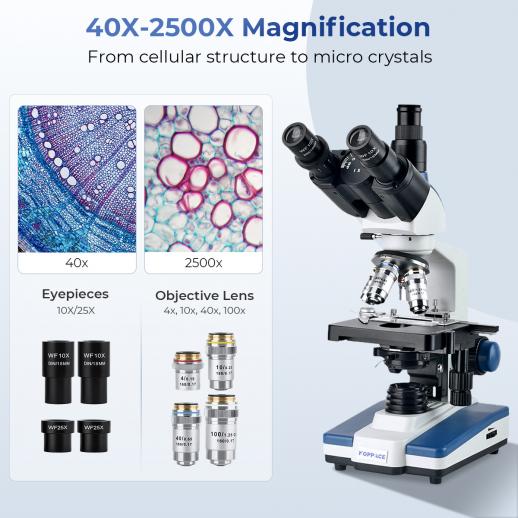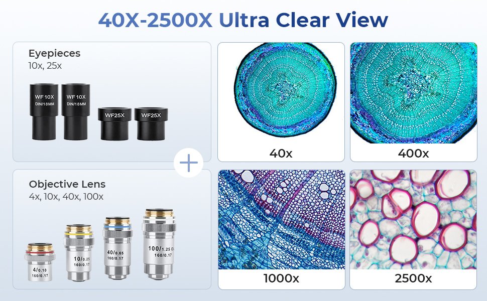 - * Lab-grade Plan Achromatic Optics (40X-2500X): See the difference with 4 lab-grade plan achromatic objectives (4X, 10X, 40X, 100X) that deliver a sharp, flat, and color-accurate image across the entire field. With high-eyepoint 10X and 25X WF eyepieces, this compound microscope offers a 40X-2500X magnification range, perfect for everything from basic biological studies to detailed cellular analysis.