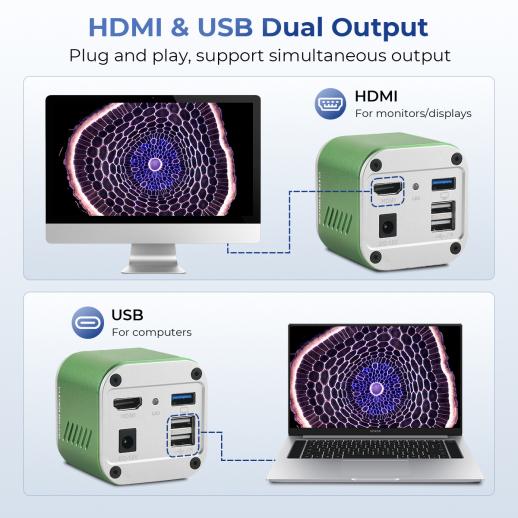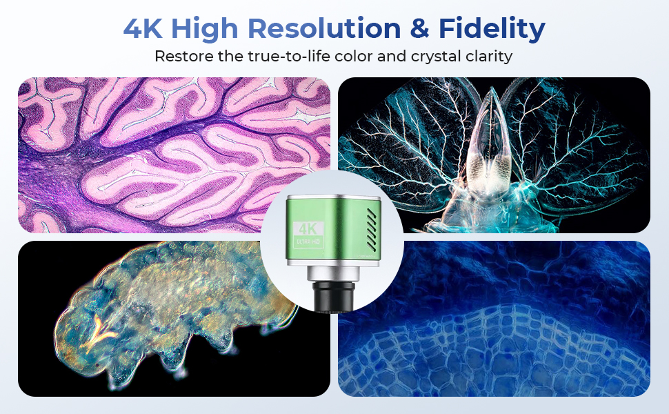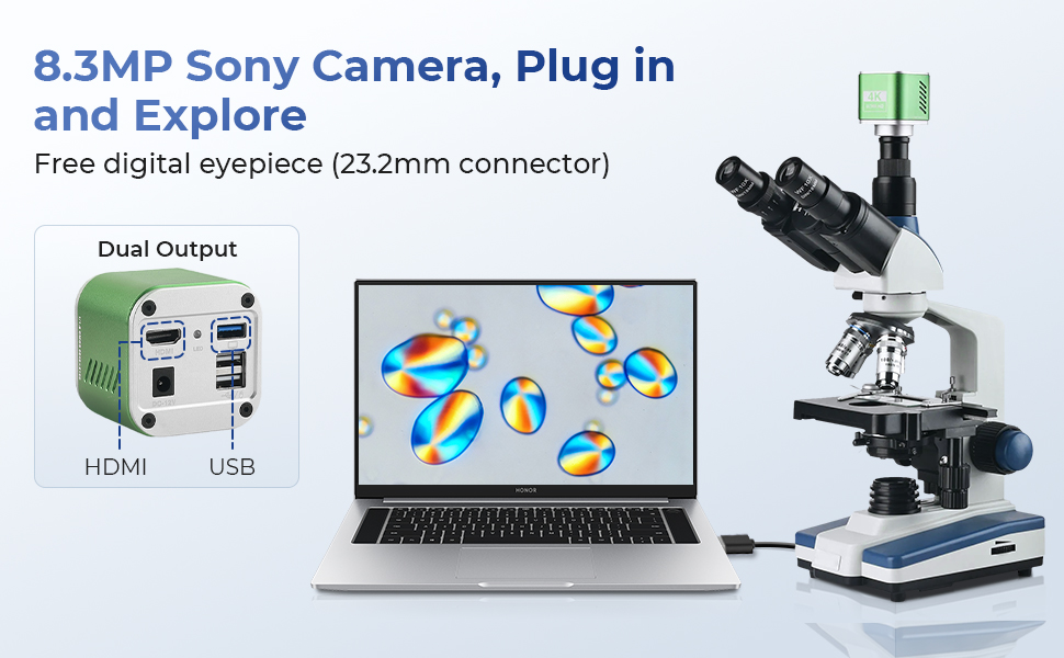 - * Professional 4K Camera Included: Kentfaith lab microscope comes with a 4K electronic eyepiece featuring an 8.3MP Sony sensor and a large 1/1.8" image sensor. It captures up to 99.8% of microscopic details with uncompromising clarity in 3840×2160 UHD resolution. Equipped with both HDMI and Type-C outputs, it enables real-time projection to monitors or PCs. Bonus: a free analysis software is included.