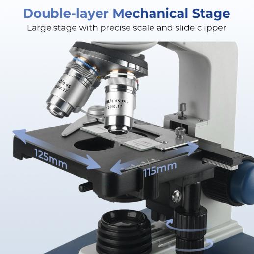 - * Precision Double-Layer Mechanical Stage: The 125×115mm stage comes with specimen clips and a micrometer for 1.0mm precise movement along X and Y axes. Effortlessly explore different parts of your samples and return to exact positions. Low-handed coarse and fine focus, with 20mm coarse travel and 0.002mm fine precision, ensures fast, accurate focusing without repeated adjustments.