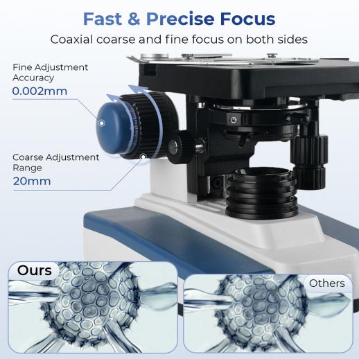 With low-position coaxial coarse and fine focus knobs on both sides, our compound microscope provides a 20mm coarse travel and a 0.002mm fine precision. You can quickly find the target and pinpoint the details, saving you time and frustration during long sessions.