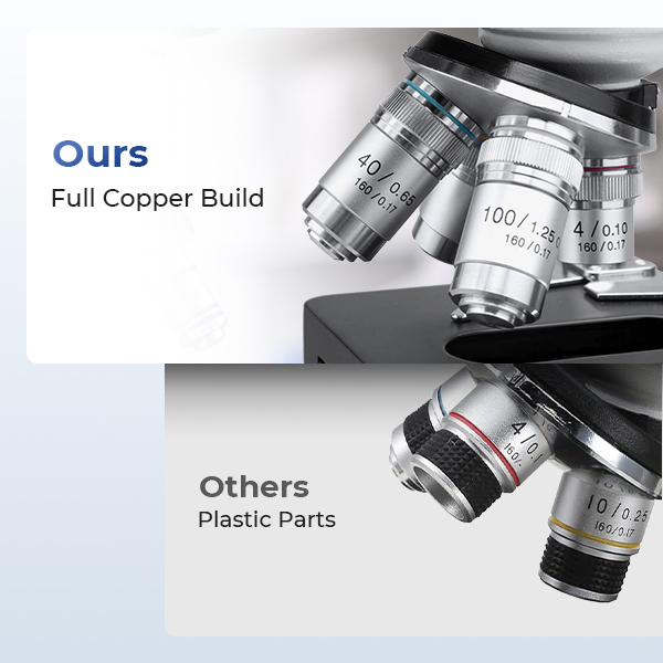 All objectives are crafted from solid copper, offering superior durability compared to plastic components. The 4 plan achromatic lenses (4X, 10X, 40X, 100X oil immersion) greatly reduce color fringing and deliver edge-to-edge sharp, flat-field clarity for professional observations.