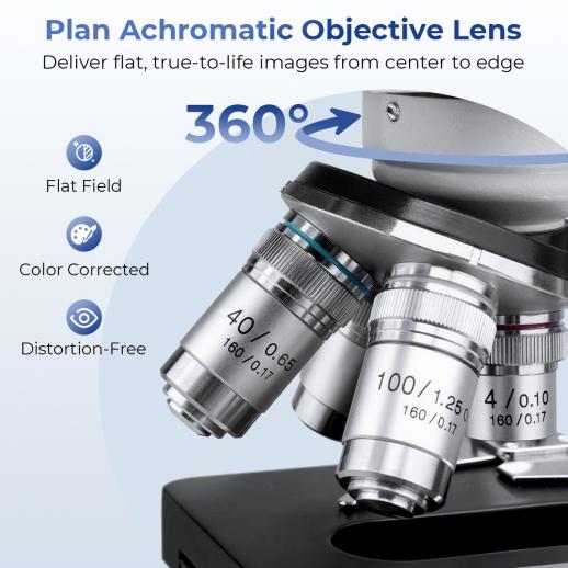 - * Lab-grade Plan Achromatic Optics (40X-2500X): See the difference with 4 lab-grade plan achromatic objectives (4X, 10X, 40X, 100X) that deliver a sharp, flat, and color-accurate image across the entire field. With high-eyepoint 10X and 25X WF eyepieces, this compound microscope offers a 40X-2500X magnification range, perfect for everything from basic biological studies to detailed cellular analysis.