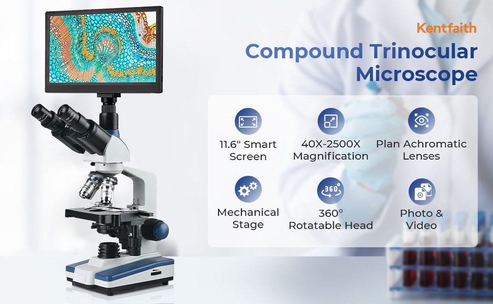 Compound Microscope with 11.6-inch Smart Screen, 40X-2500X Magnification, PC Connection, Plan Optical System, Mechanical Stage, Kentfaith